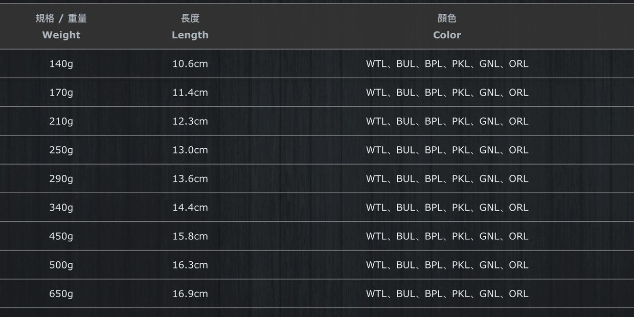 Weight:140g、170g、210g、250g、290g、340g、450g、500g、650g